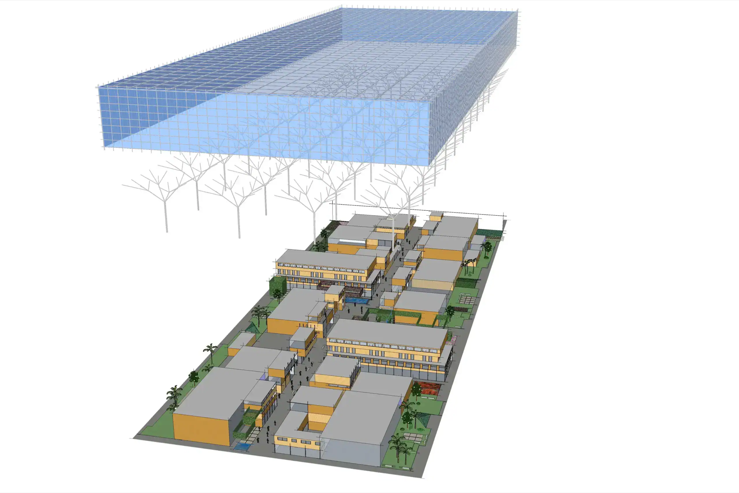 Ziel ist die Erforschung und Entwicklung eines innovativen und ökologischen Gestaltungskonzeptes, insbesondere zunächst gewerblicher Nutzungen unter großflächigen Klimahüllen.